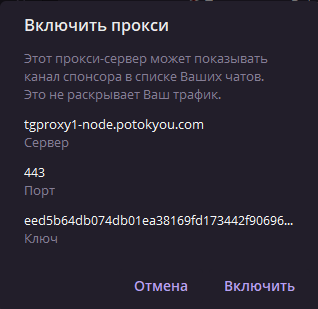 Нажмите «Включить». Готово — трафик Telegram идёт через прокси.